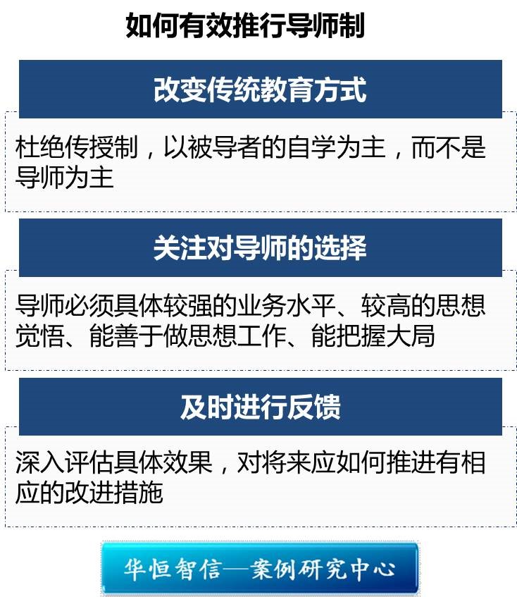 像以前的师父带徒弟一样的导师制度,言传身教的意义在于把许多不能通过或者很难通过媒体表达的知识经验扩散开来,有助于隐形知识的转化。其精髓实际在于,通过“身教”与“言教”,让企业文化潜移默化在每一个身上,最终造就志同道合的一群志士。那么如何才能有效发挥导师制的作用,实现隐性知识和企业文化的渗透呢?