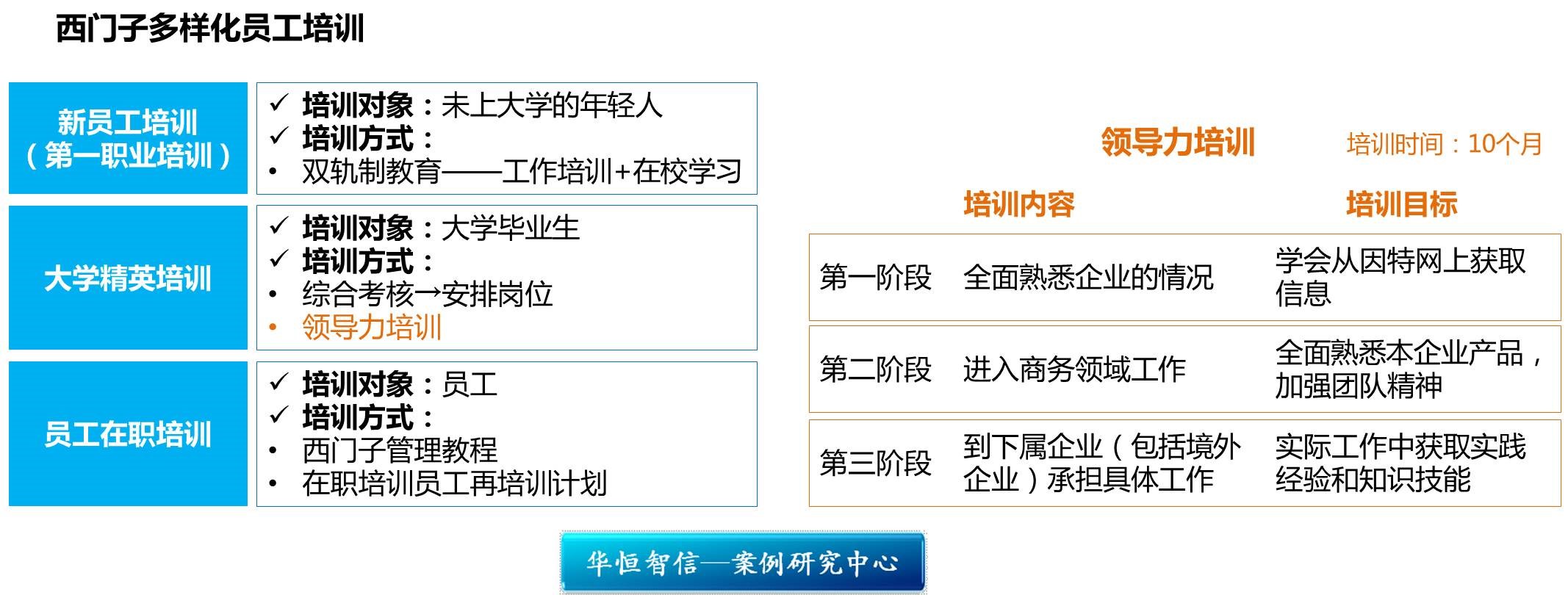 作为拥有三十余万名员工的电子电器领先企业,西门子在员工培训上独树一帜,从新员工培训,到大学经营培训,再到分阶段的员工再培训,西门子的培训涵盖所有员工,提供最有针对性的培训,帮助员工成长,同时大力保障了西门子的持续发展。