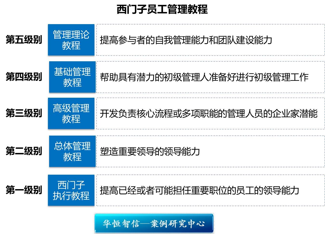 西门子员工的在职培训和进修主要有两种形式:西门子管理教程和在职培训员工再培训计划,其中管理教程培训尤为独特和成效卓著。西门子员工管理教程分五个级别,各级培训分别以前一级别培训为基础,从第五级别到第一级别所获技能依次提高。第五级别为管理理论教程,培训对象是具有管理潜能的员工,主要是为了提高参与者的自我管理能力和团队建设能力,内容包括西门子企业文化、自我管理能力、个人发展计划、项目管理、了解及满足客户需求的团队协调技能。第四级别是对具有较高潜力的初级管理人员进行的基础管理教程,让参与者准备好进行初级管理工作,培训内容有综合项目完成、质量及生产效率管理、财务管理、流程管理、组织建设及团队行为、有效的交流和网络化。第三级别是高级管理教程,面向负责核心流程或多项职能的管理人员,开发参与者的企业家潜能,主要培训公司管理方法、业务拓展及市场发展策略、技术革新管理、西门子全球机构、多元文化间的交流、改革管理、企业家行为及责任感。第二级别则是总体管理教程,培训对象是西门子的重要领导,旨在塑造他们的领导能力。培训涵盖企业价值、前景与公司业绩之间的相互关系、高级战略管理技术、知识管理、识别全球趋势、调整公司业务、管理全球性合作。第一级别为西门子执行教程,针对已经或者有可能担任重要职位的管理人,提高他们的领导能力。培训内容和日程灵活多变。