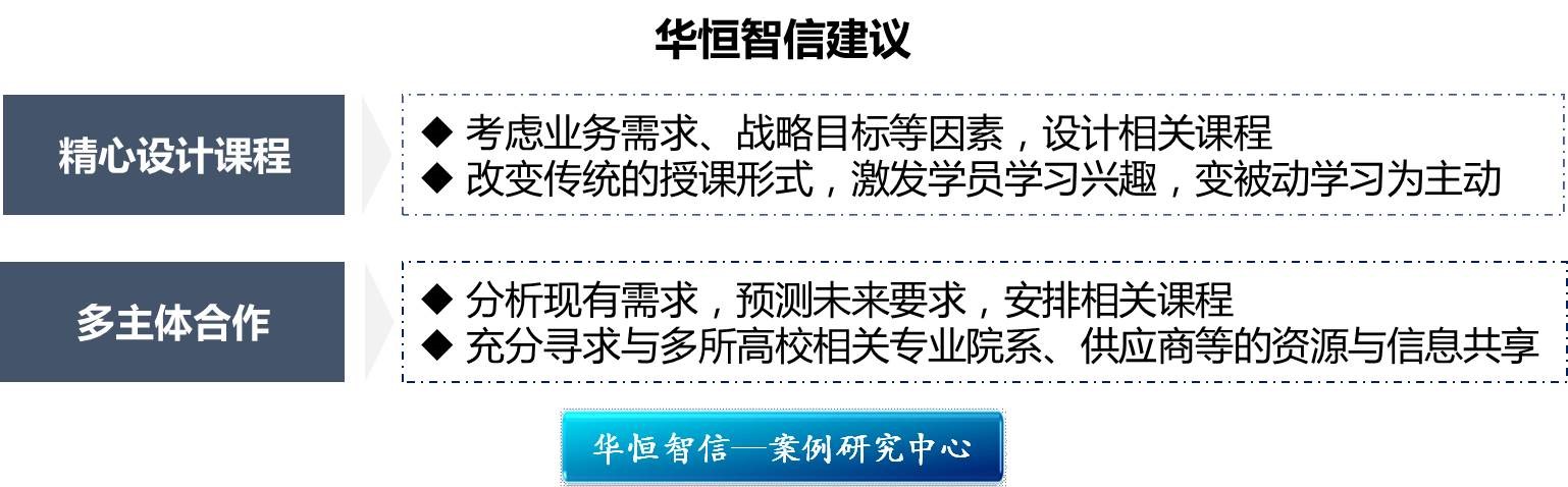 现阶段中国的企业大学大多依托高校资源,合作方式单一。企业为了丰富和创新大学学科,一方面分析产业链上合作伙伴、客户和供应商的需求,预测未来产业链对人才知识、技能要求,针对该要求安排员工培训课程,培养满足企业未来长期发展战略需求的人才,为企业未来迅速抢占市场先机打下坚实基础。这一措施效果取决于需求分析的准确度,投资风险较大。另一方面,充分寻求与多所高校相关专业院系、供应商等的资源与信息共享,包括课程共享、教师资源共享,将可控资源转化为自有资源,实现共赢。