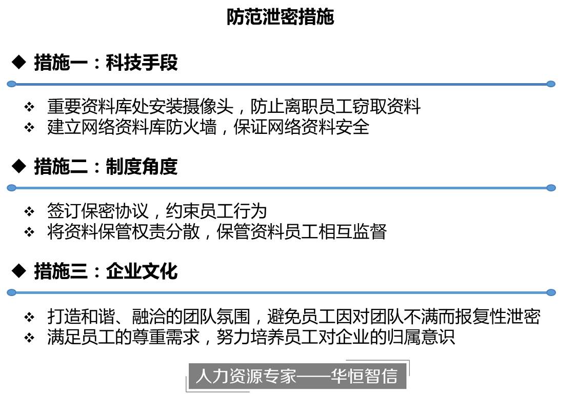 尽管员工泄密很难做到完全控制,但仍然可以采取一些防范措施,例如保密协议的签订、技术监管、权责分散等。许多企业都采取了以上列举的措施,但员工泄密事件还是偶有发生。对于这一现象我们是十分痛心的。在咨询服务中我们发现,企业大多采取外部监管的方式来防范员工泄密,但却往往忽略了员工内部因素的影响。从哲学的角度来说,内因比外因更重要,外因通过内因起作用。企业也应该重视员工忠诚度、公平感等内部因素,降低离职员工泄密的可能性,减少企业损失。