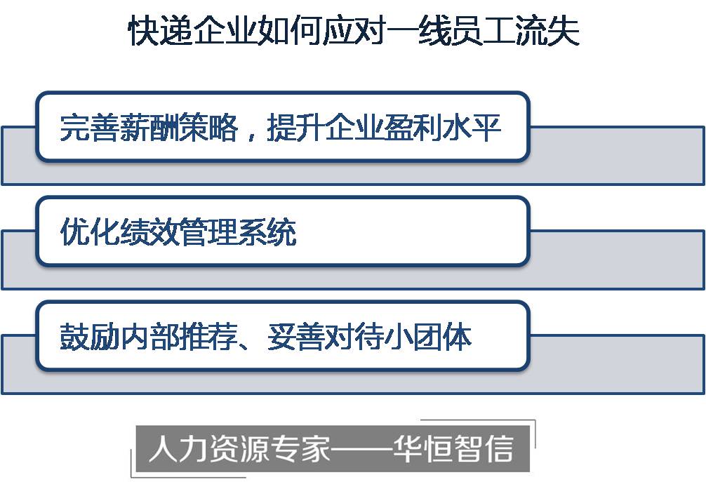 随着我国互联网及电商的飞速发展,现代快递业广泛地服务于社会的各个领域,这意味着需要非常多的一线快递员,来满足工商企业及居民的服务需求。 然而,由于薪酬低、工作强度高、压力大、工作环境差及绩效管理制度不完善等原因,快递行业的员工流失率一直居高不下。快递企业该如何应对一线员工的流失呢?华恒智信分析员来为您解析: