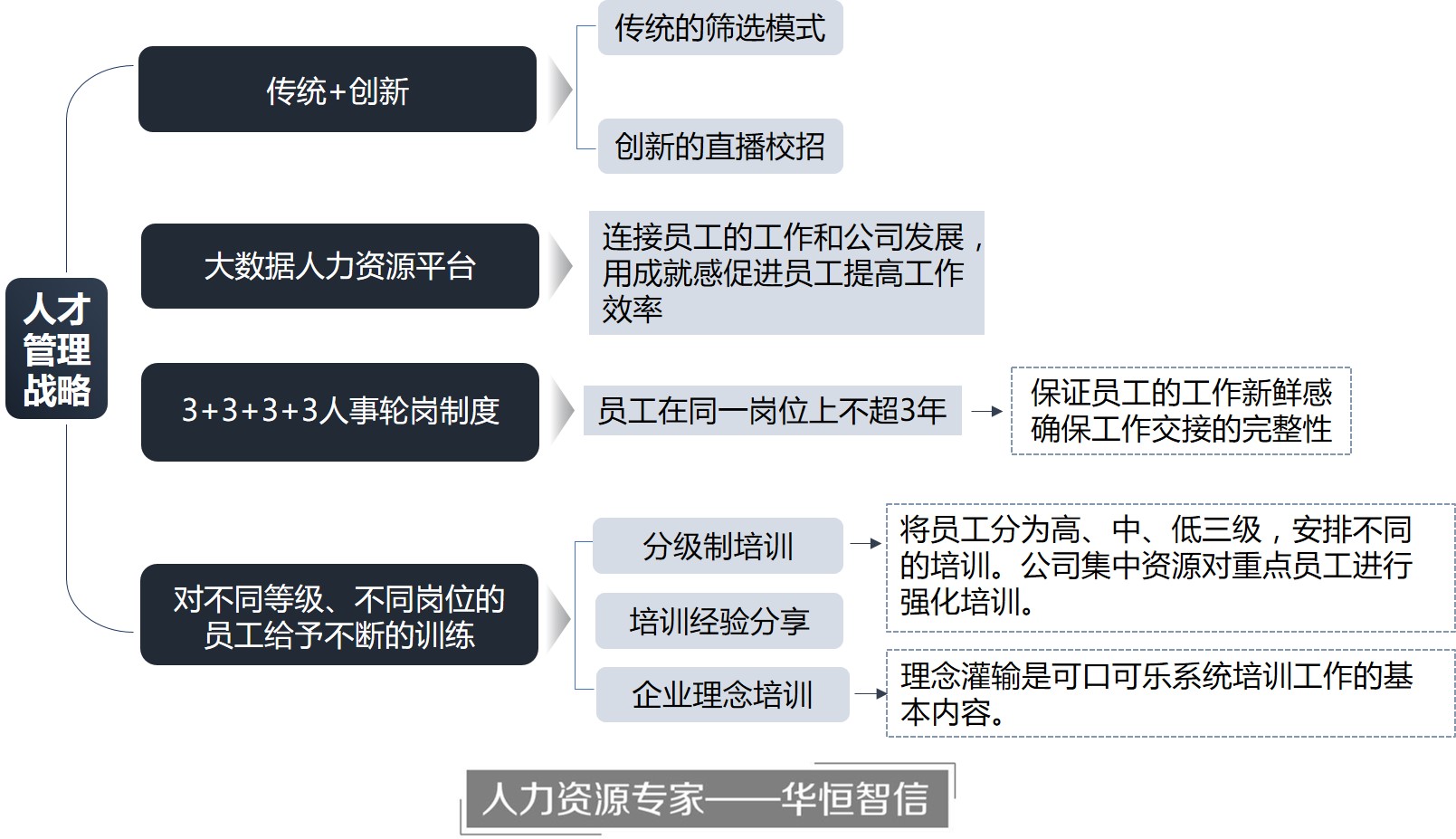 从采取跟随潮流的方式吸纳年轻人,用先进的大数据平台充分发挥企业人才的才能,到保持员工对工作的新鲜感的3年轮岗和优化资源分配的分级培训,可口可乐将传统的人才培养理念与现代科技相结合创造出自己的人才培养战略。