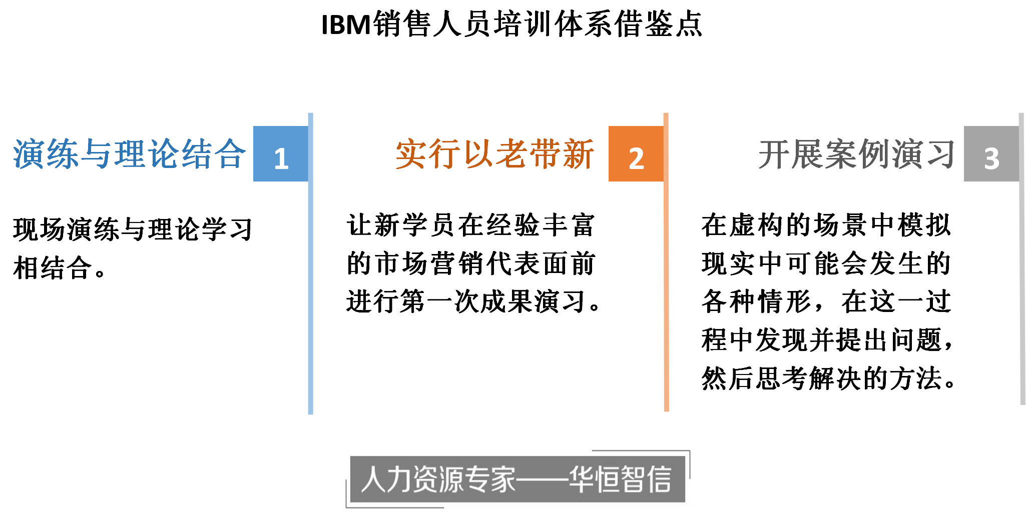 IBM公司一直追求卓越,特别是在人才培训、造就销售人才方面取得了成功的经验。具体地说,IBM公司决不让一名没有经过培训或者未经全面培训的员工到销售第一线去。因为IBM公司认为销售人员的一言一行都对公司的形象和信用影响极大。如果准备不足就仓促上阵,会使一个很有潜力的销售人员夭折,也有损于客户对于公司的认识或者是信任。因此该公司用于培训的资金充足,计划严密,结构合理,一到培训结束,学员就可以有足够的技能,满怀信心地同用户打交道。