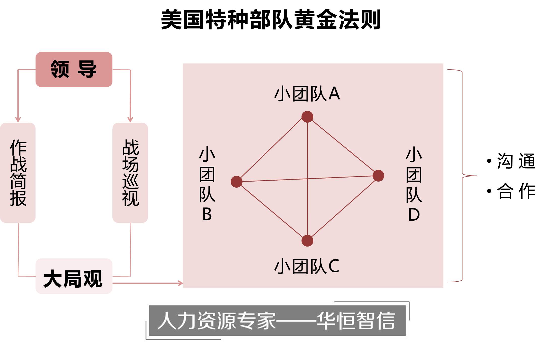 美军特种部队通过实战总结出的黄金法则正是:如何将各小型团队适应力强、内聚力强的优点扩大到企业这一级别。美军打造了一个巨大的指挥机构,但是其所具有的敏捷性,是原先小型团队才会具备的。可想而知,这样的“公司”会有多么强悍的战斗力。
