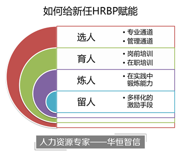 根据HRBP的工作职责不难发现,HRBP不仅需要对公司总体的人力资源管理制度和相关专业知识有清晰、透彻的认知,还需要了解具体业务部门或事业部的业务,并具备针对业务部门的特殊战略要求提供人力资源管理方案的能力。因此,从业务转HRBP可能缺乏人力资源知识,而相较于传统的HR而言,HRBP还需要具备一定的与具体业务相关的专业知识。而在企业经营和管理的实践中,由于缺乏专门的HRBP人才,许多企业往往直接从企业的人力资源部抽调一批HR到各业务部门或事业部来担任HRBP的职责。而这些HR往往并不具备业务相关的知识和技能,这就导致许多企业中新上任的HRBP在工作中往往都会遇到一些痛点如角色定位模糊、对业务缺乏深入了解、对工作束手无策等。这些痛点的出现不仅造成了企业内部人力资源的浪费,还极易出现新上任的HRBP由于不了解业务的具体情况而对业务部门或事业部的日常经营添了麻烦的情况。因此,如何给新上任的HRBP赋能,使其发挥其应有的价值已经成为了许多企业的难题。华为经过长期的研究和实践总结出了一套完整的给HRBP赋能的方案,华恒智信团队结合过去的项目经验认为企业给HRBP赋能可以从选人、育人、炼人、留人四个方面入手。