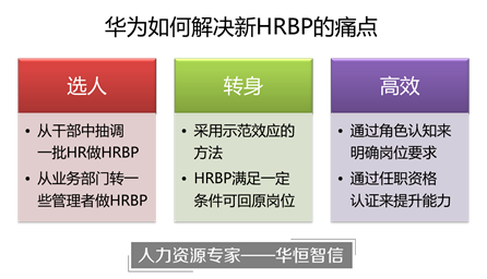针对新上岗的HRBP遇到的这些痛点,华为的解决方式是选人-转身-高效,解决新HRBP的痛点。