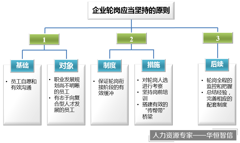 因此,华恒智信专家建议,企业轮岗应当坚持以下原则:首先,轮岗要建立在员工自愿和有效沟通的基础上,有针对性地应用于那些对于自身职业发展规划尚不明晰,或是有志于向复合型人才发展的员工身上,为他们提供接触到更多岗位的机会;其次,企业要从制度上保证轮岗衔接阶段的有效缓冲,包括但不限于:认真对轮岗人选进行考察、坚持岗前培训、在轮岗的接替者与被接替者之间搭建有效的“传帮带”桥梁;最后,做好轮岗全程的监控和把握,不断总结经验,完善相应的配套制度。