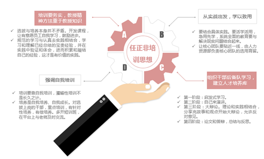 ![]() 在人才培养方面,任正非提出“培训不要太高档,关键是教会怎么做事”的观点。从实战出发,培训做事的方法和精神比知识的堆积更重要。 |