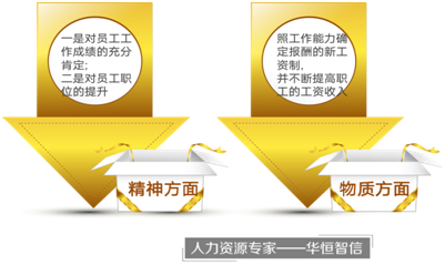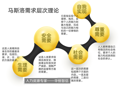 其次,注重员工的个人发展。在马斯洛需求理论中,自我实现的需要是最高层次的需要,它是指实现个人理想、抱负,发挥个人的能力到最大程度,完成与自己的能力相称的一切事情的需要。也就是说,人必须干称职的工作,这样才会使他们感到最大的快乐。马斯洛提出,为满足自我实现需要所采取的途径是因人而异的。自我实现的需要是在努力实现自己的潜力,使自己越来越成为自己所期望的人物。华恒智信认为可以通过施行不同的制度规定来实现:第一, 自荐制度:职员在工作一段时间后,可以自己主动向人事部门“申请”,要求调动和升迁,经考核合格,也可以提拔使用。第二, 内部选拔与能力选拔优先原则:在职位有空缺时,人事部门向公司内部招聘适当人选,不一定非在单位中论资排辈依次提拔管理者。第三,留学交流机会:定期选派技术人员、管理人员到国外学习,可以收获到更多方面的知识,除了专门设立的在职教育培训外,还有“自我开发训练”,即调动员工的寻求知识、提高能力的主动性和积极性,使企业员工正确认识自己,挖掘自己可能拥有的潜能,克服缺点,充分施展自己的才华。