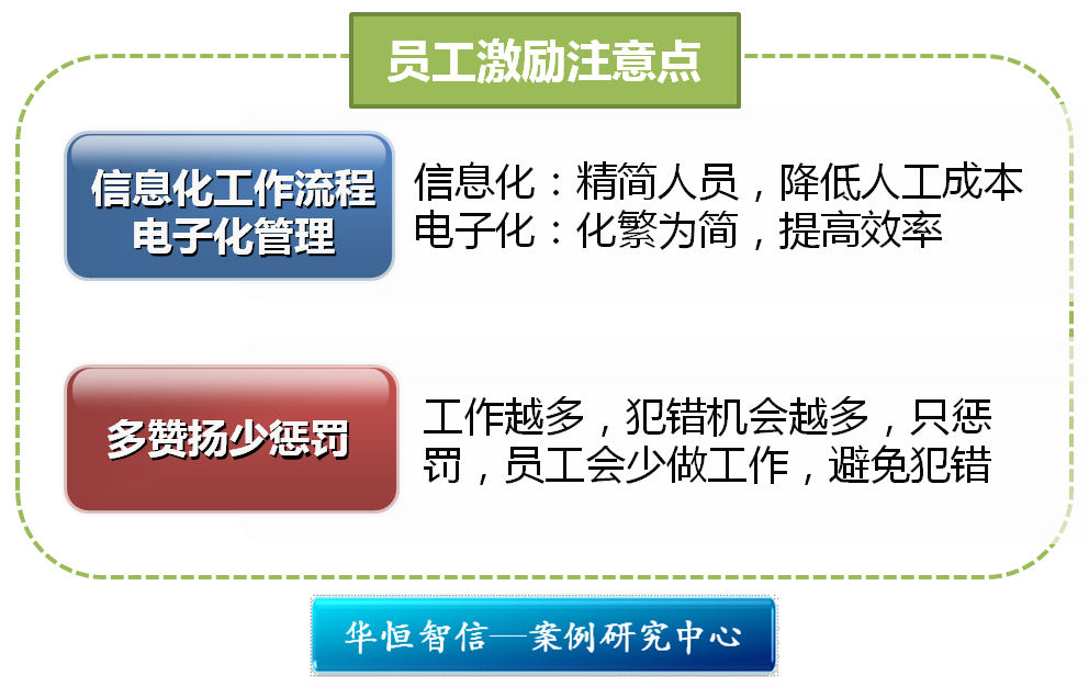 其次,多赞扬,少惩罚。该公司的观点非常值得认同:一个人工作做得越多,犯错误的机会也就越多,如果不允许别人犯错误,甚至惩罚犯错误人,那么雇员就会尽量少做工作,避免犯错误。员工犯得错误只要不是原则性的,不是无法弥补和非常严重的错误,可以提示员工,指出其工作上的错误,但是少用和慎用惩罚的管理方式。惩罚会极大地打击员工的工作积极性,产生负向的影响。