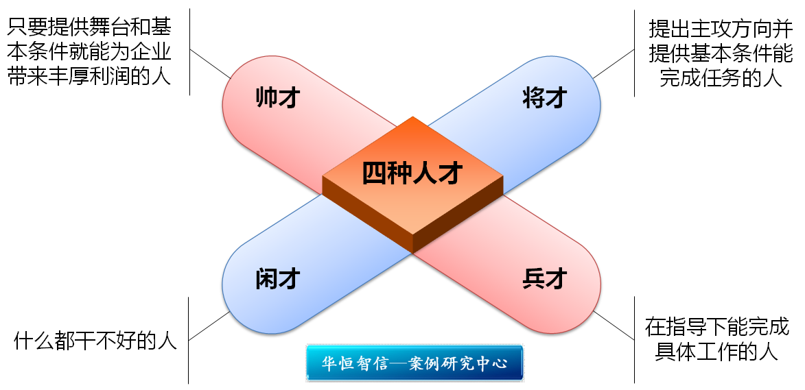 清华紫光把人才分为帅才、将才、兵才和闲才四类。帅才是只要提供舞台和基本条件就能为企业带来丰厚利润的人;将才是提出主攻方向并提供基本条件能完成任务的人;兵才是在指导下能完成具体工作的人;闲才则是什么都干不好的人。企业中四类人都有,如何安排好四类人的结构是企业人力资源配置的关键。帅才是目前企业中最缺少的人才,但太多也会让企业不稳定;闲才要尽量地减少,他们会影响企业活力,所以清华紫光提倡合理地配置前三类人才。人才在层次上不同,即使在同一层面,也有专长的不同,所以还要讲求“文理渗透,合理搭配”。人才工程不是对个别人才的挑选和提拔,而是对帅将兵三才的合理配备和发展。