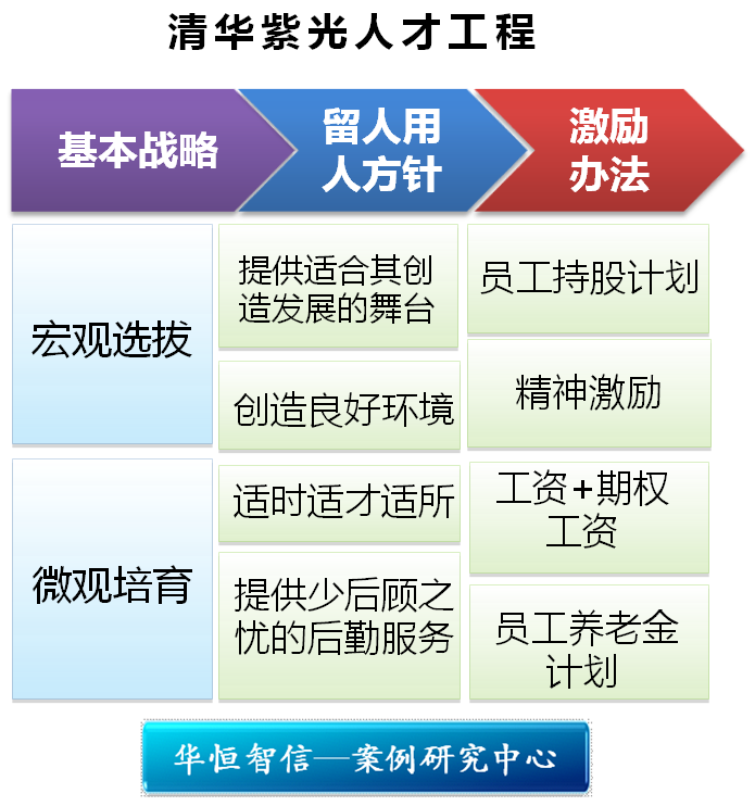 清华紫光留住人才和使用人才所采取的方针是提供适合其创造发展的舞台,创造良好的工作条件和环境,提供少后顾之忧直到无后顾之忧的后勤服务。