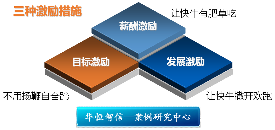对快牛们的激励种类繁多,根据咨询经验,我们认为:从三个方面入手,可以极大的提高快牛们的满意度:一是薪酬激励,二是目标激励,三是发展激励。薪酬激励是快牛们安身立命的基础,目标激励给人工作动力,促使其不断超越,而发展激励是根本,让员工实现自身价值。三者之间是相辅相成,而且是不可逆的。通过这样的激励,既能满足员工现实需求,又能兼顾其未来发展,这样,鞭子不打,牛也照跑,优秀的人才越干越有劲。