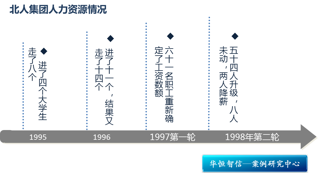 北人集团人力资源部长王建中不无感慨地说:“退回到1997年,情况却没这么简单。由于谈判工资与当时推行的全国统一的国有企业‘岗位工资制’不相吻合,因此争议很大,甚至人民日报内参也编发了有关文章。然而,人才流失严重的现实却不容人迟疑,厂里1995年好不容易进了4个大学生,当年就走了8个,1996年进了11个,结果又走了14个,因此只能摸着石头过河了。”
