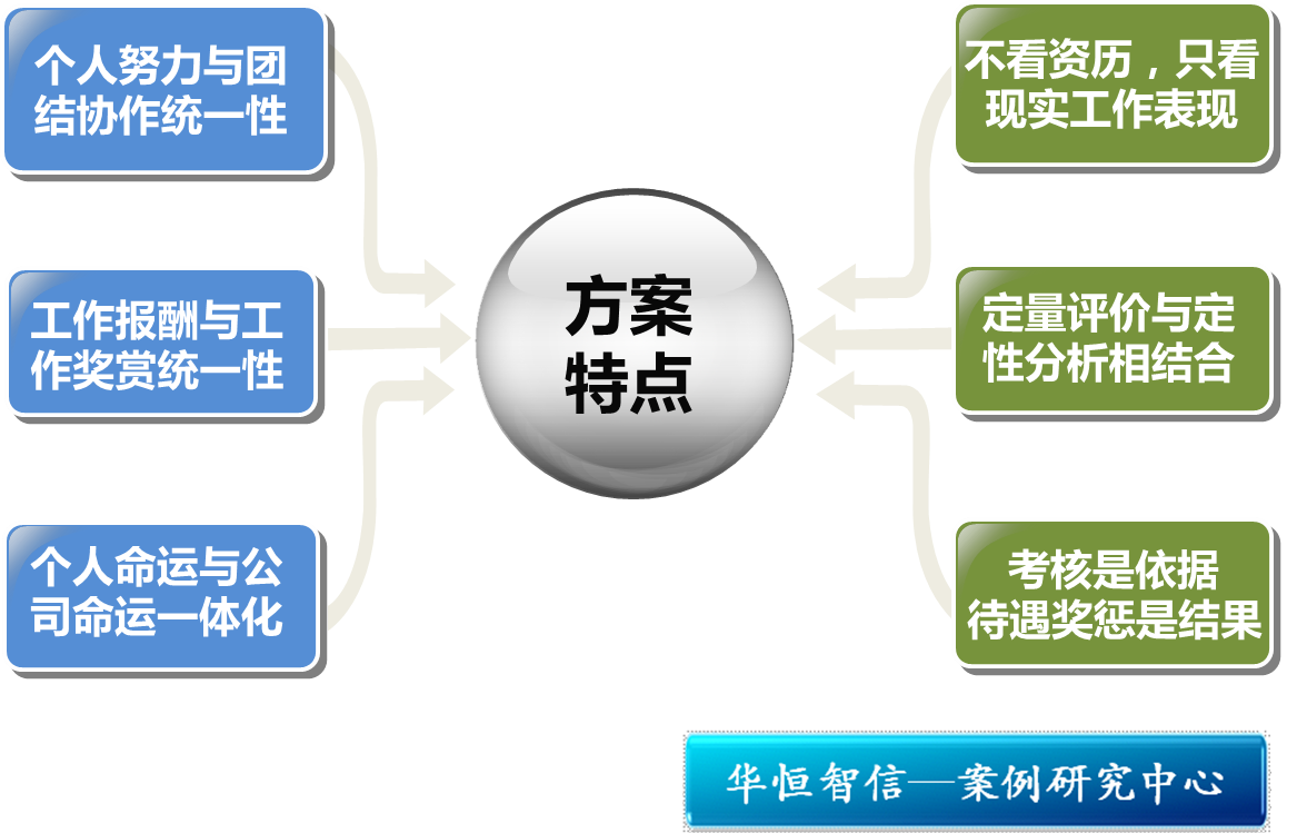 这套方案的特点:强调个人努力与团结协作的统一性;工作报酬和工作奖惩的统一性;员工个人命运与公司命运一体化;不强调资历,只看重现实的工作表现;定量评价与定性分析相结合;业绩考核与工资待遇、奖惩相互依存,考核是客观依据,待遇、奖惩是结果。