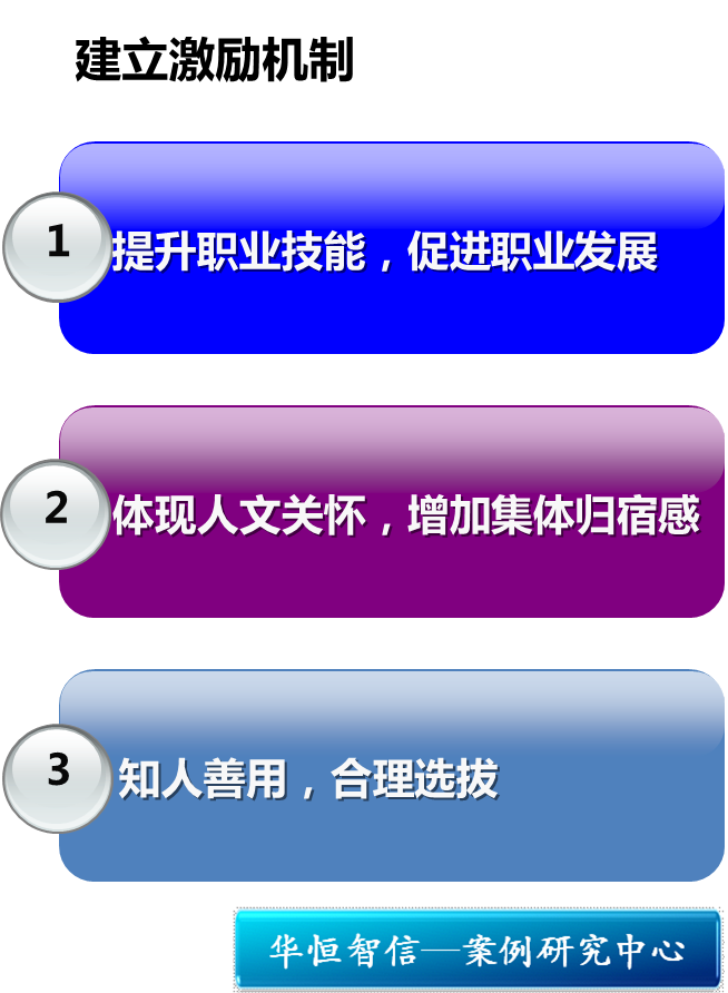 (3) 物质激励和精神激励相结合。当员工对物质激励的追求下降之后,适当的精神激励起到的作用可能更大,更明显。心理学表明,内部动机比外部动机的持续性更长,激励强度更强。所以适当的精神激励可能会起到意想不到的效果。