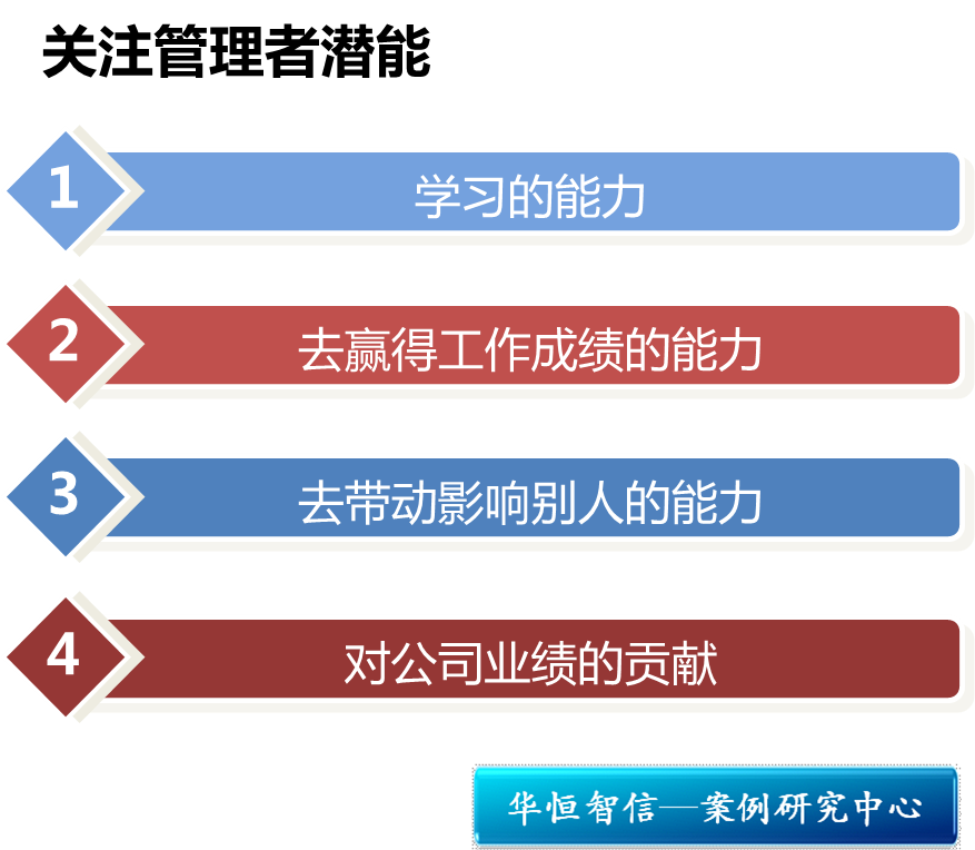 北电网络另一个激励员工的举措在于,员工的升职并不仅仅依赖于业绩,要提拔一名员工,可能会对员工有两年的高绩效的要求,这个高绩效包括他的工作业绩和行为表现(Outcome/Behavior),但这个结果只是员工升职的一个参考,他们更注重一个管理者的潜能,主要包括4方面:
