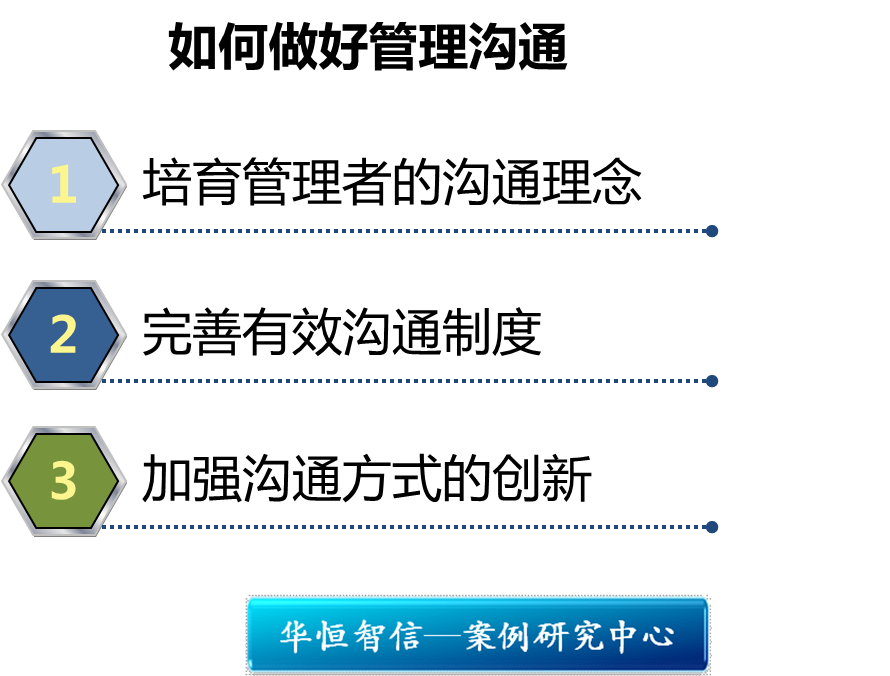 对于合资企业来说,企业员工的文化理念差异更为明显,企业政策的实施的阻力也更大,如何解决这个问题呢?华恒智性认为,企业在实施管理实践时要做好管理沟通。案例中所说的加薪风波,如果企业事先告知员工企业的薪酬支付标准,与员工对薪酬制度达成一致意见,做好薪酬沟通工作,就不至于引起员工如此大的不满。那么企业该如何完善企业内部的信息沟通呢?