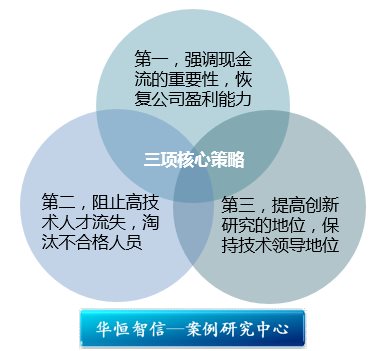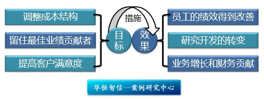 1989年郭士纳接管IBM公司,公司困难重重,根据公司的支出计划现金很快就会告急,员工中高技术人才流失率超过20%,由于股票价格的持续下跌,使得股票期权留住高级人才的办法已经失效,甚至许多股票期权的执行价格高于股票的市场价格,公司正在面临巨大的亏损,收入增长几乎微乎其微。公司高层领导认识到这个具有杰出技术并在市场上具有领导地位的公司正在面临严重的挑战,企业的战略变革已经刻不容缓。对此做出三项核心策略:第一,强调现金流的重要性,并恢复公司的盈利能力;第二,让IBM公司成为吸引人才的工作场所,阻止高技术人才流失,同时实施适当的裁员政策,淘汰不合格人员;第三,提高创新研究的地位,保持公司的技术领导地位。企业管理层认识到,薪酬战略变革是保证三项核心策略实施起作用的杠杆,是经营变革成功的关键。