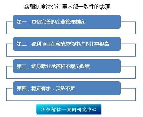 改革前的IBM公司经过多年的发展和完善已经发展到成熟阶段,公司管理上采用家庭管理模式,文化上趋于保守。企业的薪酬制度过分注重内部一致性。具体表现为:第一,具备完善的企业管理制度,包括完善的工作评价方案。在工作分析、职位说明书、职位评价、内部薪酬结构等项目都有十分完善的制度,薪酬体系中的绩效考核因素、加薪条件、分配奖金制度遵从严格的定量标准,运用应用数学和统计学知识及相关的计算软件可以明确的表达出来,有着完善和精细的薪酬方案。第二,福利项目在薪酬总额中占的比重很高。IBM公司是一家家长式管理作风的组织,表现在薪酬制度上就是慷慨地为员工提供各种形式的福利待遇:补充养老金、补充医疗福利、补充住房政策、乡村俱乐部、完善的教育培训机构、保障性的工作环境建设等等,在当时的美国没有第二家公司的福利可与之媲美。第三,终身就业承诺和不裁员政策。在IBM公司提供的高福利保障环境中,公司所有员工都享有一个特殊的身份证,即“IBM雇员”,保守的公司文化使得公司职员遵循:踏踏实实地做好份内工作就可以得到高额的工资报酬,享受高福利待遇。第四,稳定有余,灵活不足。在传统的薪酬战略下,基本薪酬是员工为企业工作所获得的绝大部分报酬,而基本薪酬的关键决定因素是员工所从事的工作特性,而且这种“特性”被分为多种级别以区别员工的工作级别,加薪和可变薪酬通常占工资总额的极少部分,稳定高额的工资待遇反应在工作上就是稳定、保守的作风,员工仅仅注重职位级别的升迁而忽视技能的提高,导致了缺乏灵活性和创新性。