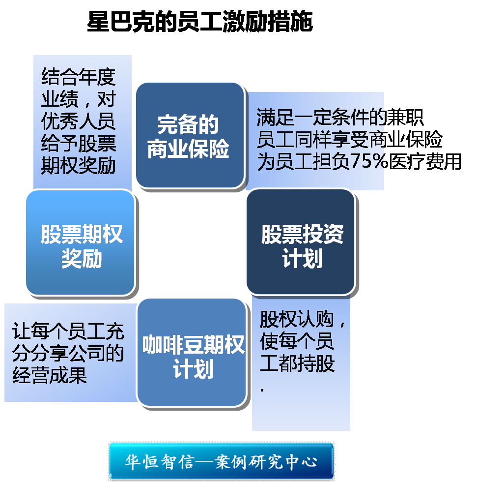 对于一个企业来说,激励制度是多样的,而各种激励制度间存在着有机联系,因此应灵活运用各种激励方式,形成合理化组合显得尤为重要,而星巴克正是意识到了这一点。在星巴克公司,员工不叫“员工”,而是被称作“合伙人”。这不是一种文字游戏,而是有着实在、实惠而又丰富多彩的股票期权计划为支撑的战略安排。在这种安排之下,每一个员工都有机会成为星巴克的股东,因此被称为“合伙人”。