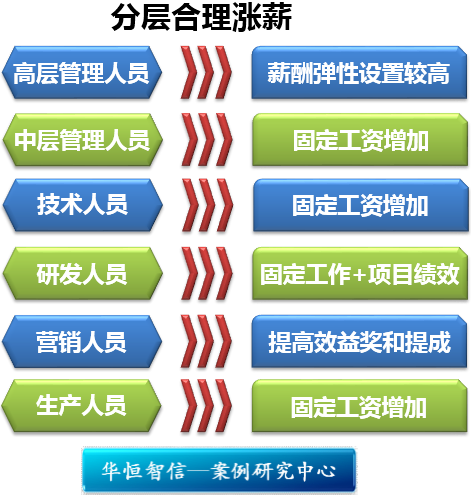 对于高层管理人员,因希望他们能最大限度地为公司增值,因此涨薪重点放在浮动的绩效奖金和年终效益奖上;基层管理人员的涨薪则以固定部分为主,绩效奖金及年终效益奖金为辅。在这个过程中,王总还充分考虑到员工的心理承受能力,将中高层管理人员的薪酬调整分成了几次,逐步涨薪到位。