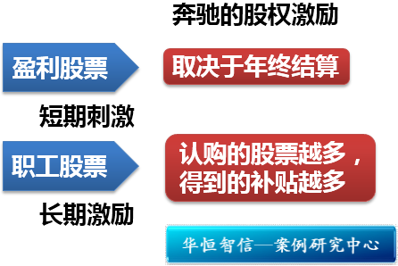 除了新实行的盈利股票外,20多年来奔驰公司的员工们也可以购买职工股票。每年有40%到50%的有购买股票权的人利用了这种权利。据悉,员工们把自己的股份视为存钱罐,而不是到期后就得尽快变成现钱的有价证券。而且认购的股票越多,得到的补贴也越多,每股最高可达450马克。奔驰公司实行的盈利股票加职工股票的做法是增强员工同企业息息相关意识的两个手段。这两个手段起到互补的作用,一年的盈利股票由于是当年支付红利,因此起着短时间的刺激作用。而职工股票是对企业的投资,多数是长期的。这样的投资促使员工关注股票行情,他们会因为股票行情的变化而关注企业的兴衰存亡。