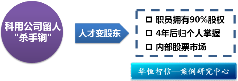 科用公司是一家高技术研究和工程公司,为美国第55大私营公司。激励员工、留住人才、把职工变成股东是该公司创业之初提出的口号。现在,公司职员拥有公司90%的股权,其余10%掌握在离开公司的顾问或职员手中,科用公司规定持股者离开公司时必须把股份卖回给公司。调查表明,在科用公司工作至少3年的职员中,那些从未购买公司股票的职员流动率为12%,而那些购买了股票不管其数目何等之小的人流动率为5%。只要你为公司揽得一份新合同,你就有机会额外购买与合同金额成一定比例的股票。这只是科用公司精心设计的退休、股票购买和股票奖励计划制度的一部分。