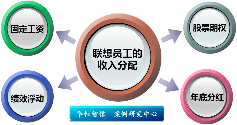 联想的干部比例比较适中:在1万多公司员工中,中级以上管理人员有200多人。单纯就规模而言,联想的每一个事业部都相当于一个中型IT企业。从薪酬结构上看,经理层跟员工层的固定工资的差异并不巨大。联想员工的收入是这样分配的:固定工资;绩效浮动;年底分红;骨干员工拥有的股票期权。经理层的收入高于普通员工,而员工的收入是跟效绩直接挂钩的。在联想,技术骨干的待遇与相应的管理者的收入没有差别。
