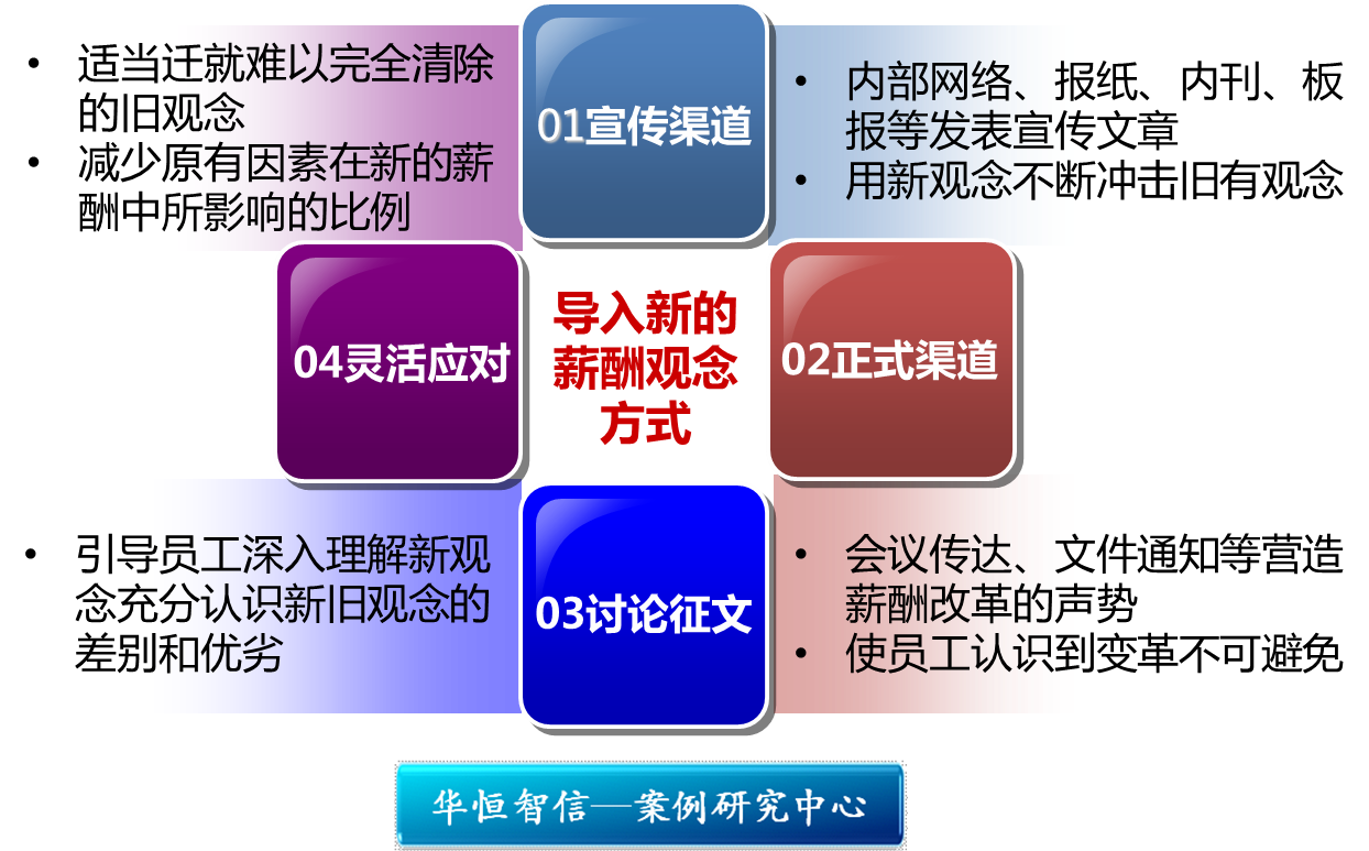 (1)利用公司的宣传渠道如内部网络、报纸、内刊、板报等发表宣传文章,从而逐渐树立新的观念,用新观念不断冲击旧有观念,如新的薪酬观念介绍、优秀企业的薪酬案例和实践经验、旧薪酬观念的问题、新旧薪酬观念的对比、先进的薪酬理论知识等。