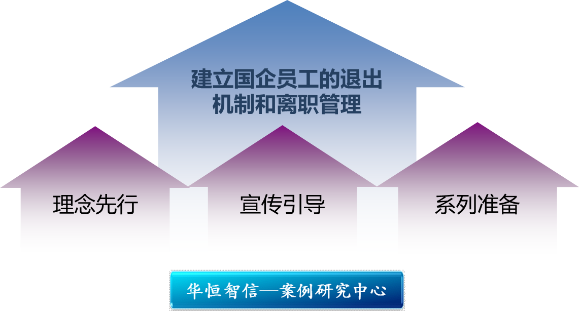 针对国有企业员工的退出机制与离职管理问题,华恒智信认为企业要推行员工退出机制与离职管理首先应理念先行。理念先行的核心是企业高层有决心和动力来支持员工退出机制的改革,并在企业内部形成理念的共识。其次进行各种形式的宣传引导,逐步影响干部职工的心态与角色定位,逐渐传递外部压力,内部形成一定的危机意识。第三步企业需做好一系列准备工作,包括定岗定编、岗位工作规范的设计、考核指标的设计等内容。这些内容的完善将从客观上保障员工退出机制的公正和公开。