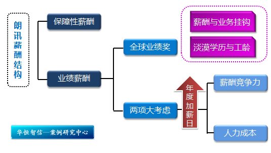 朗讯的薪酬结构由两部分构成,一块是保障性薪酬,跟员工的业绩关系不大,只跟其岗位有关。另一块薪酬跟业绩紧密挂钩。在朗讯非常特别的一点是,朗讯中国所有员工的薪酬都与朗讯全球的业绩有关,这是朗讯在全球执行GROWS行为文化的一种体现。