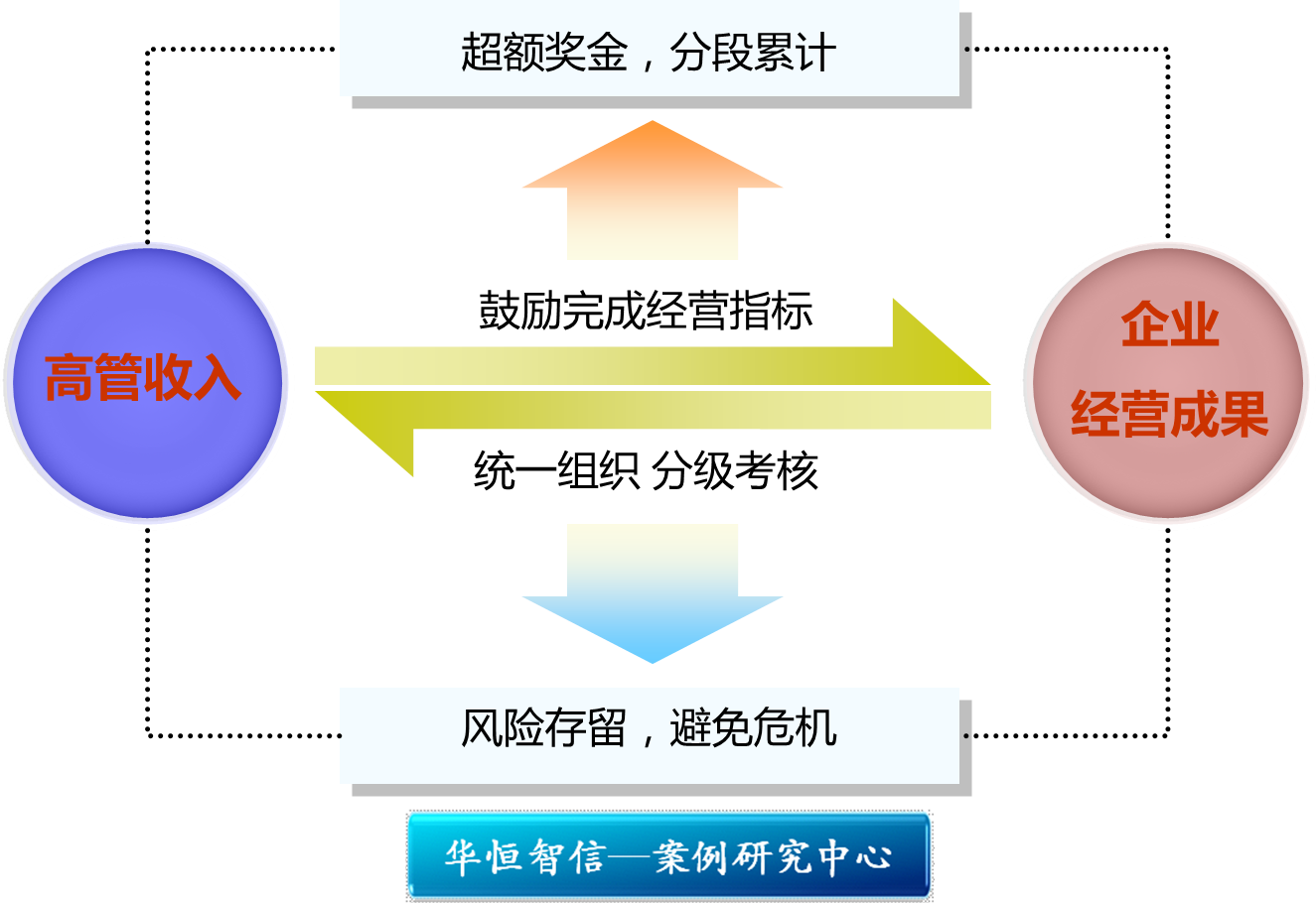 同时,为最大限度地鼓励高管团队完成公司经营目标,针对主要经营指标,如公司销售收入、利润总额等的超额完成情况,公司会给予高管团队享受超额奖金的权利:只有公司年度销售收入和年度利润总额均高于最低目标,且年度销售收入和利润总额中至少一个指标的实绩高于考核目标时(各指标的目标设置了三级:最低目标、考核目标和最高目标),高管团队方可享受超额奖励(超额奖励总额=∑年度销售收入超额完成额×相应提奖比率+∑年度利润总额超额完成额×相应提奖比率)。高管团队超额奖金总额分别与超额完成年度销售收入和超额完成年度利润总额的数额挂钩,分段累进计奖。