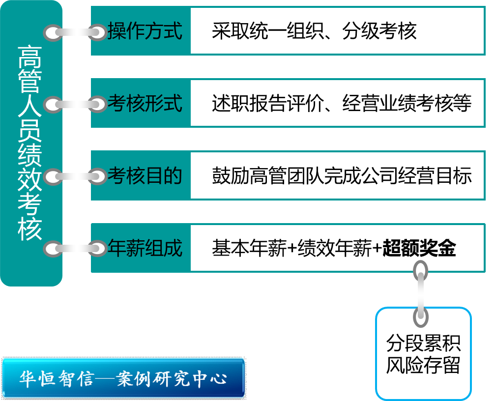 对于高管人员的绩效考核,采取统一组织、分级考核(区分总经理与其他高管人员的考核)的操作方式,主要通过述职报告评价、经营业绩考核等形式,从而实现对公司经营管理活动的全程监控与正确引导。将个人半年度述职报告、个人年度述职报告作为工作检查、计划手段,而以个人年度经营业绩考核作为主要依据来衡量高管人员的年度工作绩效(个人年度经营业绩考核的具体内容可在《年度经营目标责任书》中具体规定,包括公司经营管理指标完成情况、公司/个人重要计划工作完成情况等)。