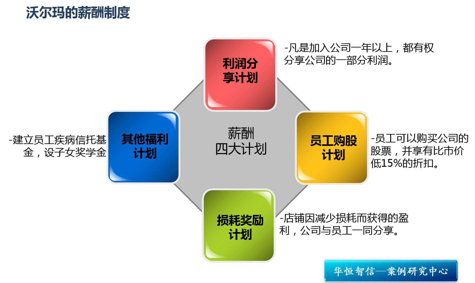 沃尔玛的固定工资基本上是行业较低的水平,但是其利润分享计划、员工购股计划、损耗奖励计划在整个报酬制度中起着举足轻重的作用。