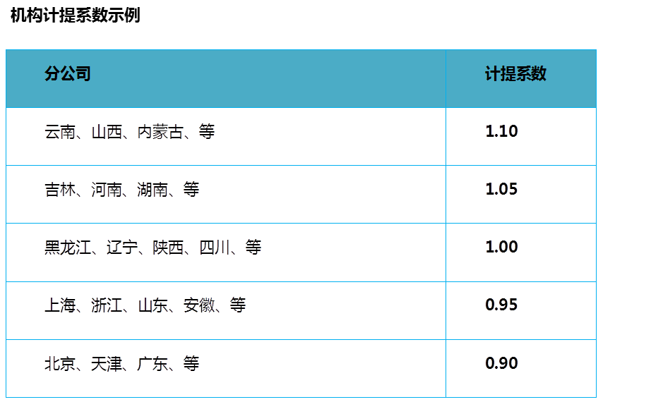 各分公司在销量提成上遵循统一的方法和标准,但是不同的分公司有不同的机构计提系数。机构计提系数根据市场状况、公司投入、人均产能等指标而确定,旨在调节不同分公司之间的销量差异,机构计提系数示例如下: