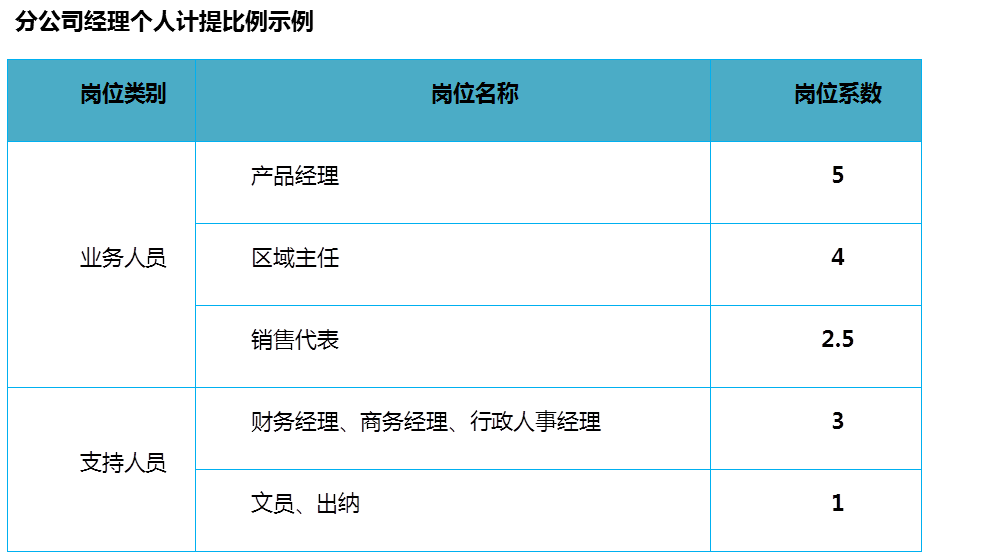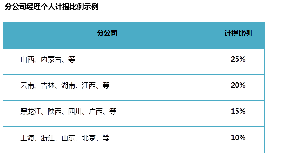 个人计提比例旨在调节分公司经理奖金的地区差,示例如下: