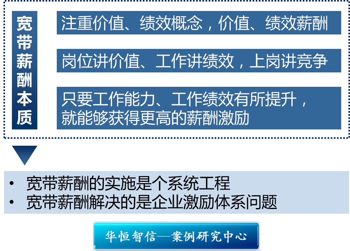 其次,公司进一步指出,宽带薪酬的实施是个系统工程,它所解决的不仅是“工资”问题,同时也是一个系统问题——一个企业激励体系问题。这里说宽带薪酬的实施是个系统工程,因为实施宽带薪酬,离不开组织优化、岗位设计与价值评估等基础要件;同样,说它解决的是一个企业的激励体系问题,是因为它较传统薪酬模式更好地解决了广大员工的考核激励、薪酬激励和培训激励。
