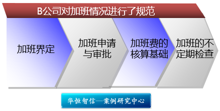B公司的《加班管理办法》一方面在加班时间上进行控制,减少加班的时数,其次在加班费核算基础上进行控制,减少加班费“单价”,最后进行监督检查,杜绝虚假加班。通过“三管齐下”,能够营造出一个较好的加班氛围。