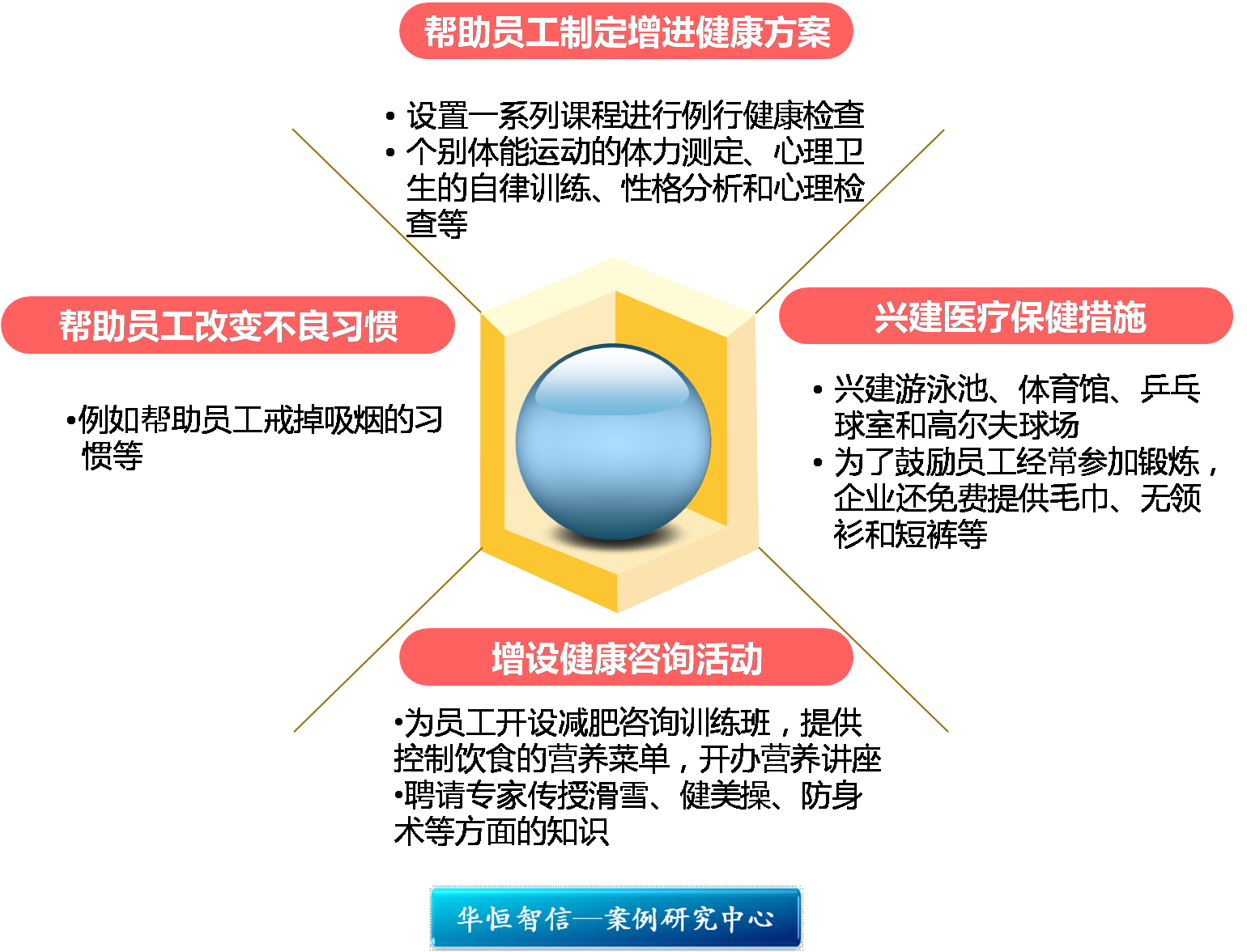 1、制定员工健康研修计划和增进健康的方案,帮助员工克服身心方面的疾病和提高健康程度。每周安排20位分布各地的员工到总公司接受健康研修训练,设置了一系列课程进行例行健康检查,还进行个别体能运动的体力测定、心理卫生的自律训练、性格分析和心理检查等;