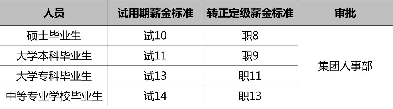 应届大中专毕业生试用及转正定级薪金参考标准: