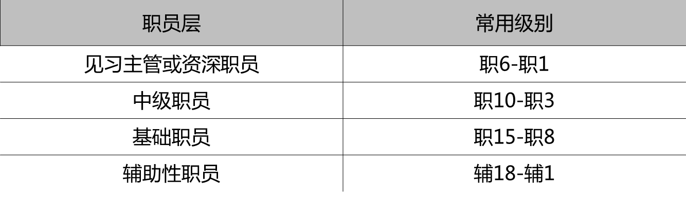 就目前公司现状,职员层和管理层各按职位高低划分三个区间,如下所列。