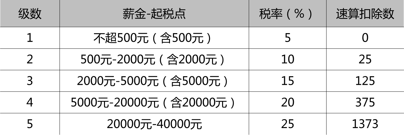 例如深圳目前的起税点为1800元。税率和速算扣除数可由下表查到: