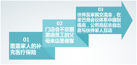 2、伙伴识天下计划 & 伙伴回家计划:员工可以申请到不同地区甚至海外门店工作,或者申请回到家乡门店。
