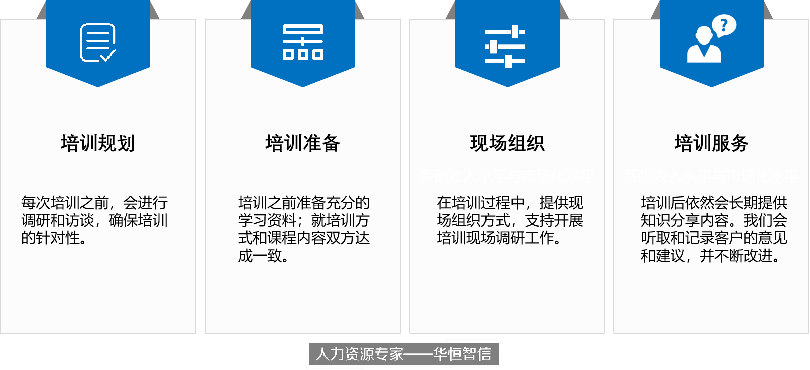 华恒智信拥有常年从事一线咨询活动的专业老师,为企业开展内训活动中,能够结合各个企业的实际问题,深入浅出,落地性强。科学清晰的流程管理更是我们的优势所在。我们强调成功的培训始于培训之前,我们的进步在于培训后真诚地倾听客户的意见和建议,并及时加以改进,我们有严格的流程管理。每次培训之前,我们的培训师都会与客户的相关人员进行调研和访谈,并就课程内容和培训形式达成一致。在培训中和培训后,我们都会听取和记录客户的意见和建议,并不断改进,这是我们获得客户长期支持的重要措施。自我加压的培训承诺制是我们的质量保证。我们率先向所有接受培训的单位郑重承诺:培训效果满意度不到80%,我们免费更换师资,直到您满意为止!