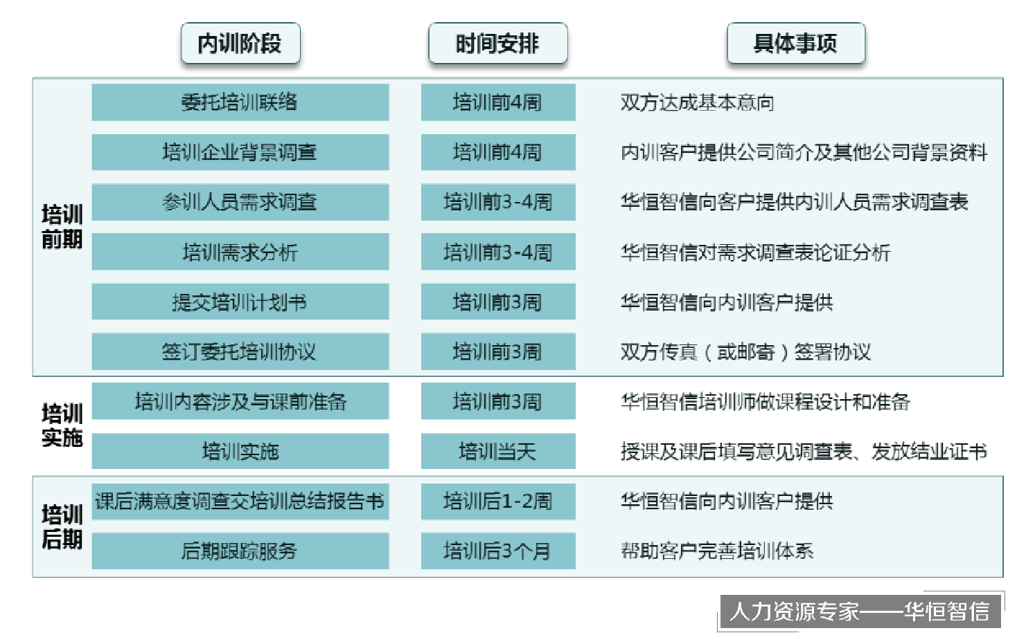 华恒智信在企业内训方面有着强大的师资队伍、丰厚的理论功底和丰富的实践经验。在不断实践中,我们认为,组织好一场成功的内训,必须具备四大要素,即:培训规划、培训准备、现场组织和培训服务。周到的规划和准备是培训获得成功的前提,而现场组织和跟踪服务是培训必不可缺的环节。四者相互配合,组成了一场高效培训的完整流程。许多培训组织者常常忽视其中的某一环节和四者之间的关联关系,导致培训不成功。