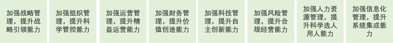 目标:到2022年,国有重点企业管理理念、管理文化更加先进,管理制度、管理流程更加完善,管理方法、管理手段更加有效,管理基础不断夯实,创新成果不断涌现,基本形成系统完备、科学规范、运行高效的中国特色现代国有企业管理体系,企业总体管理能力明显增强,部分国有重点企业管理达到或接近世界一流水平。