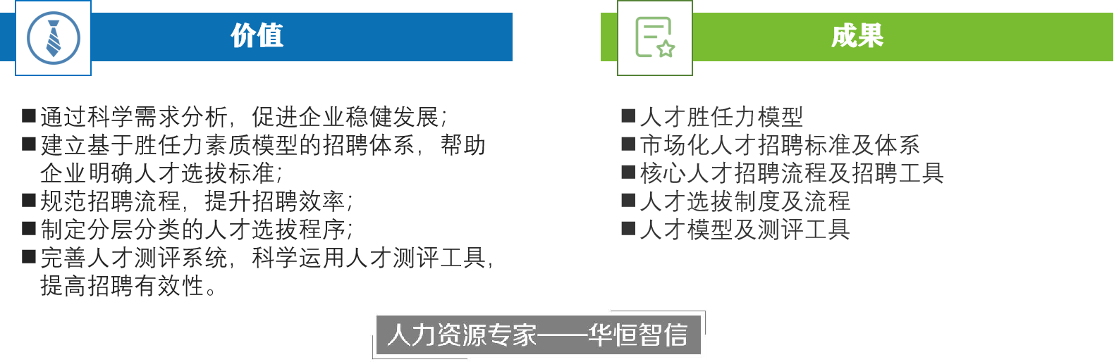 同时,华恒智信提出的招聘管理体系从系统的角度将企业的招聘管理与人力资源管理体系融合在一起,前能应用素质能力模型的量化标准,后能延展实现入职同化管理,以实现人才强企的战略目标。