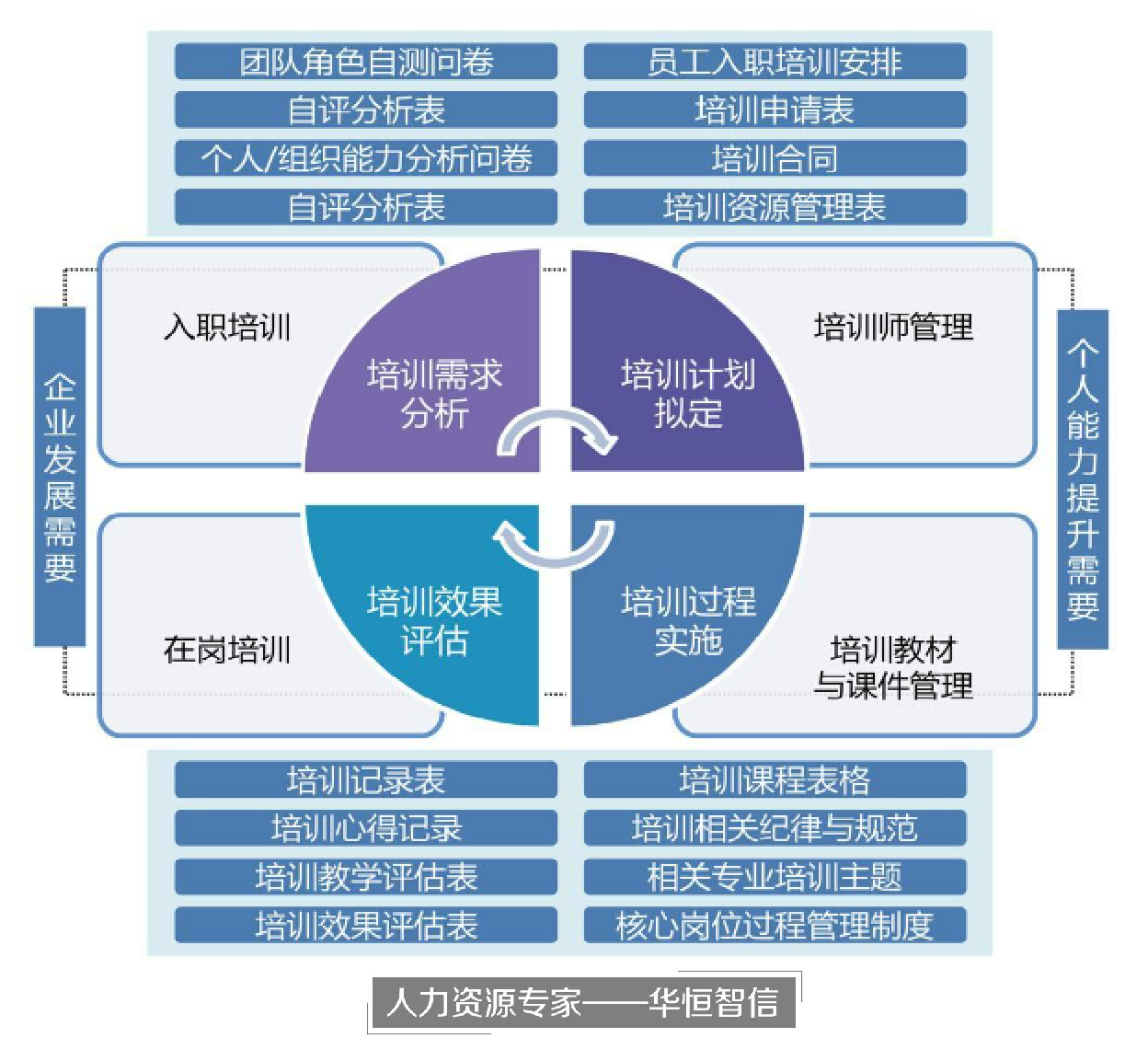 华恒智信认为企业的培训体系主要包含以下八个方面内容:培训需求分析,培训计划拟定,培训过程监控,培训效果评估,员工入职培训,员工在岗培训,培训资源管理之培训师的选择与管理,培训教材的设计与使用管理。